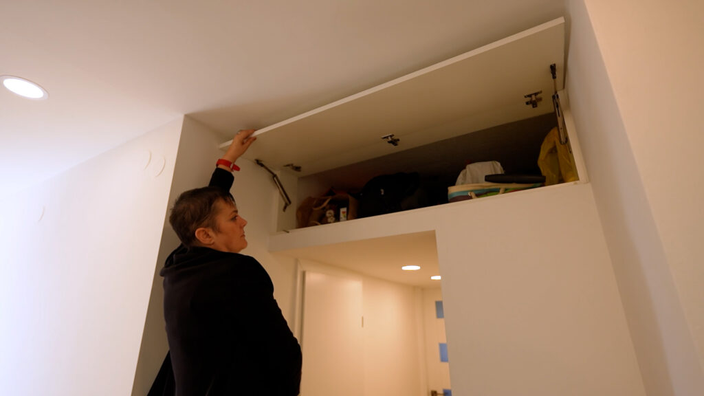 Jedna od ključnih intervencija bila je transformacija hodnika koji vodi prema spavaćoj sobi. Spuštanjem stropa do visine vrata stvoren je prostor za veliko spremište. U njemu se danas nalaze skije, sezonska oprema i hobiji koji su važan dio života stanara.