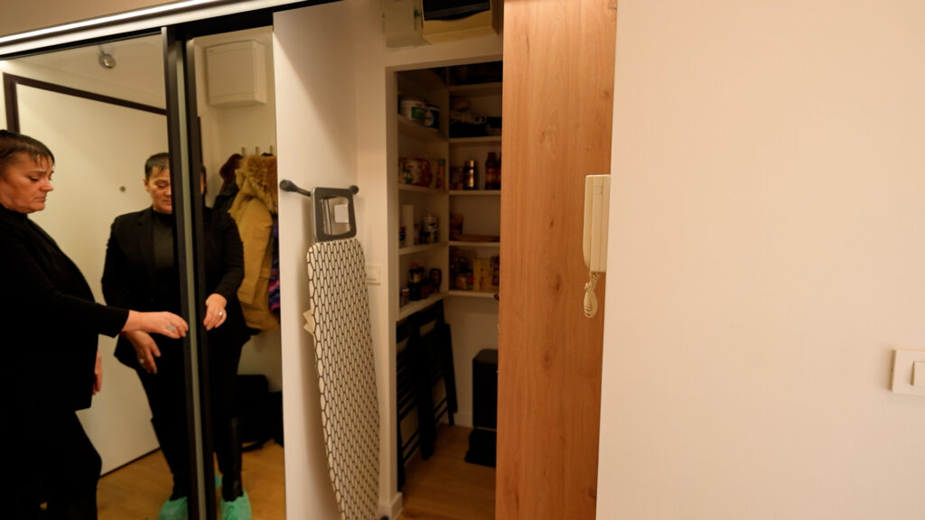 Kako bi se dodatno poboljšao dojam prostora, ostava koja je imala ulaz iz kuhinje zatvorena je, a novi ulazi izvedeni su iz hodnika. Postavljena su klizna staklena vrata u ogledalu, koja vizualno proširuju prostor.