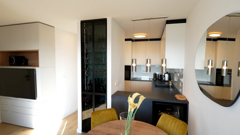 Kuhinja je iz zatvorenog prostora postala dio dnevnog boravka. Rušenjem zida prostor je otvoren i povezan, čime je stan dobio protočnost i bolju organizaciju.