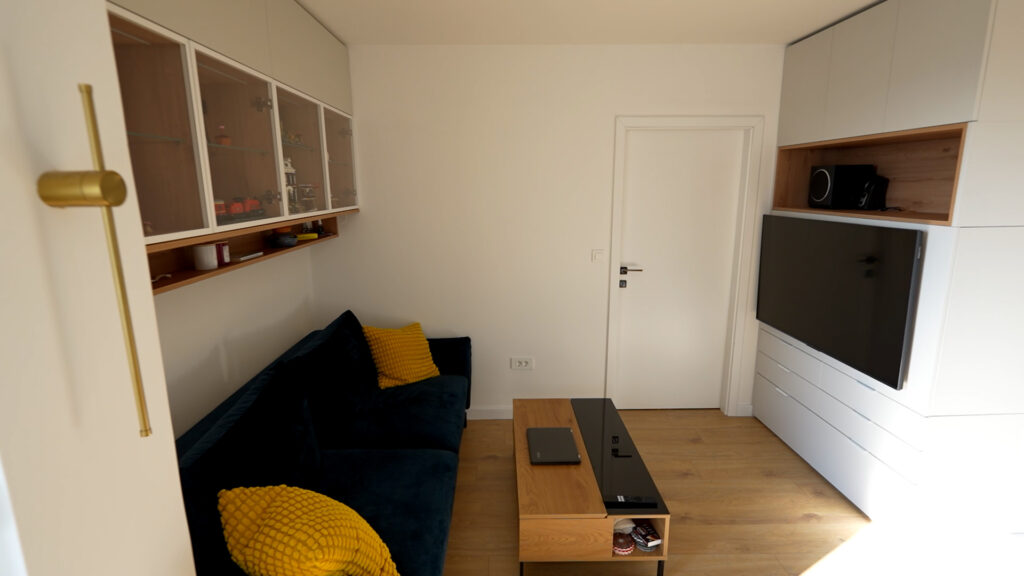 Zbog ograničenih financijskih mogućnosti, nije se uređivao cijeli stan. Fokus je stavljen na centralne zone – dnevni boravak, kuhinju i ulazni prostor. Cilj je bio stvoriti ugodno i funkcionalno okruženje u kojem se nakon radnog dana može normalno živjeti i odmarati.