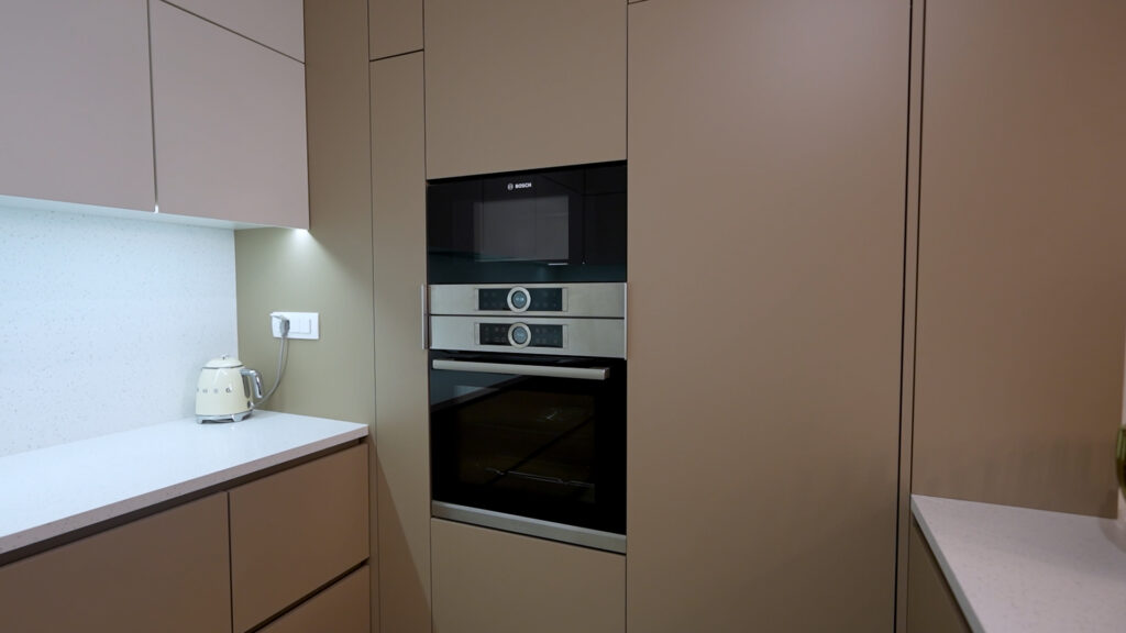 „Kuhinja je bila najvažniji dio projekta. Klijentica puno kuha i voli primati goste, pa je bilo važno da sve bude prilagođeno njezinim navikama“, objašnjava Martina Kordić. Donji elementi izrađeni su u tamnijim tonovima, dok su gornji ormarići svjetliji – kako bi se prostor vizualno otvorio i doimao prozračnije.