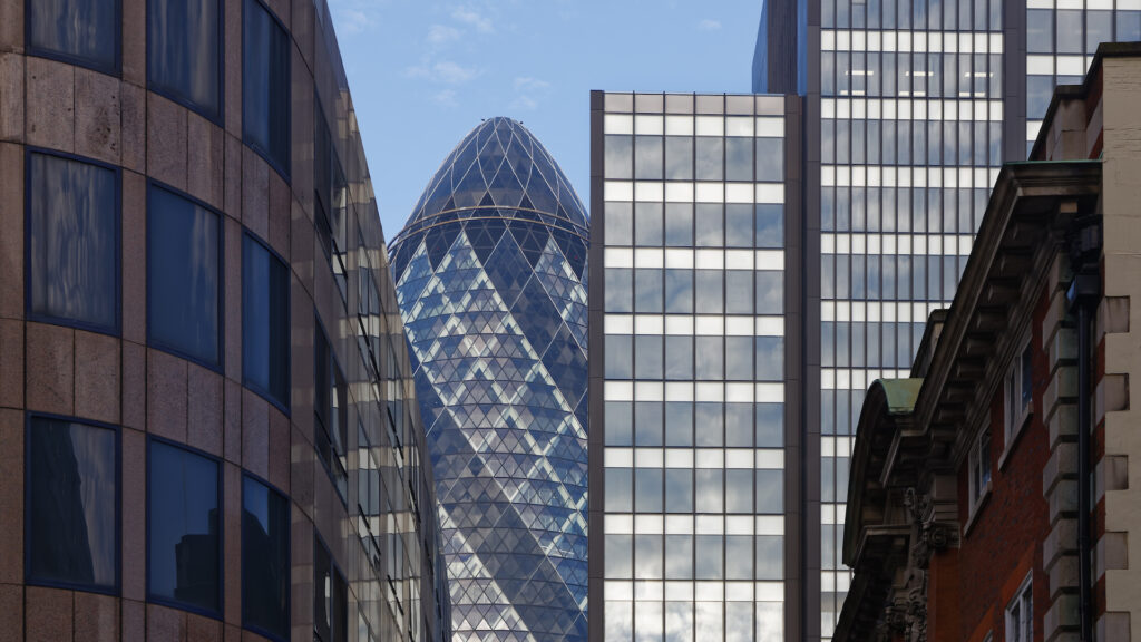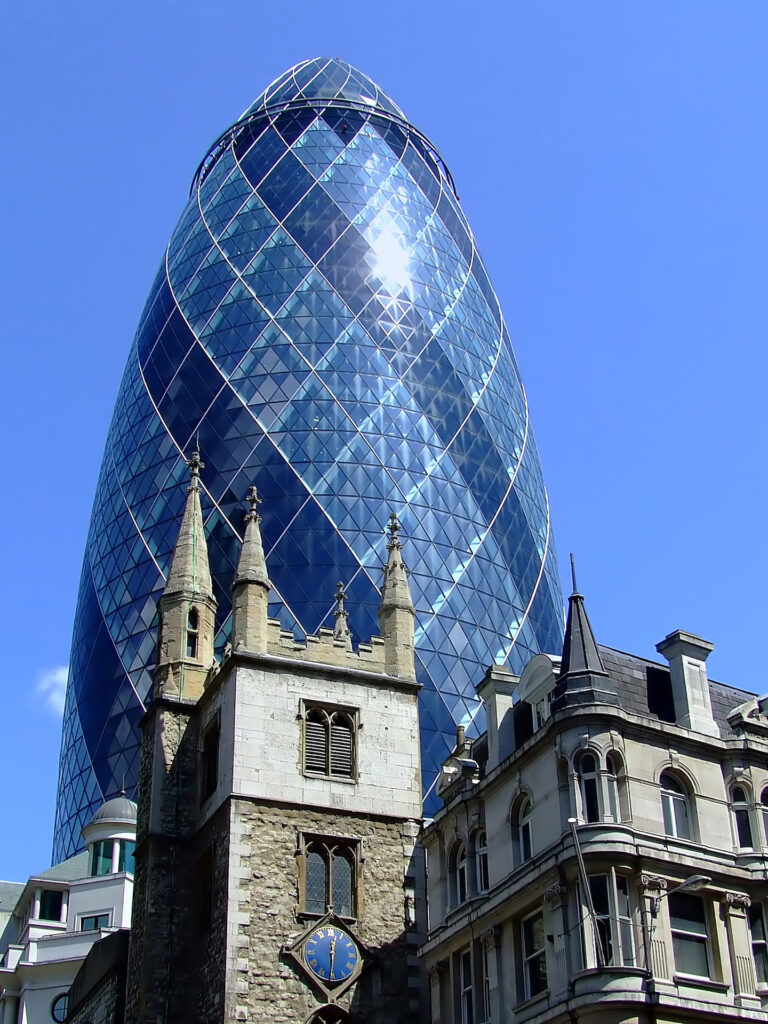 Ikoničan londonski neboder, prepoznatljiv po aerodinamičnom obliku „krastavca“, visok je 180 metara i predstavio je sasvim novu filozofiju poslovnih zgrada. Njegova fasadna dijagrid struktura omogućava prirodnu ventilaciju i obilje dnevnog svjetla, čineći zgradu jednim od pionira ekološki orijentirane visoke gradnje u Europi. The Gherkin je postao simbol Londona i jedan od najfotografiranijih modernih objekata u svijetu.