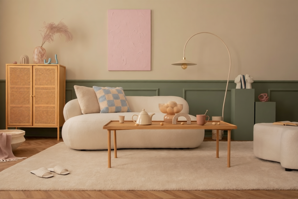 Topli bež tonovi, svijetlosiva i nježne pastelne nijanse stvaraju smirenu podlogu. Takva paleta omogućuje da zaobljeni namještaj ostane u fokusu, bez vizualnog preopterećenja.