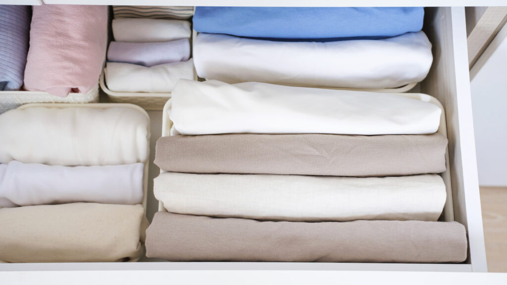 - Vertikalna pohrana u ladicama – Umjesto klasičnog slaganja, pokušajte s vertikalnim „Marie Kondo“ načinom slaganja — omogućuje bolji pregled i maksimalno koristi prostor.