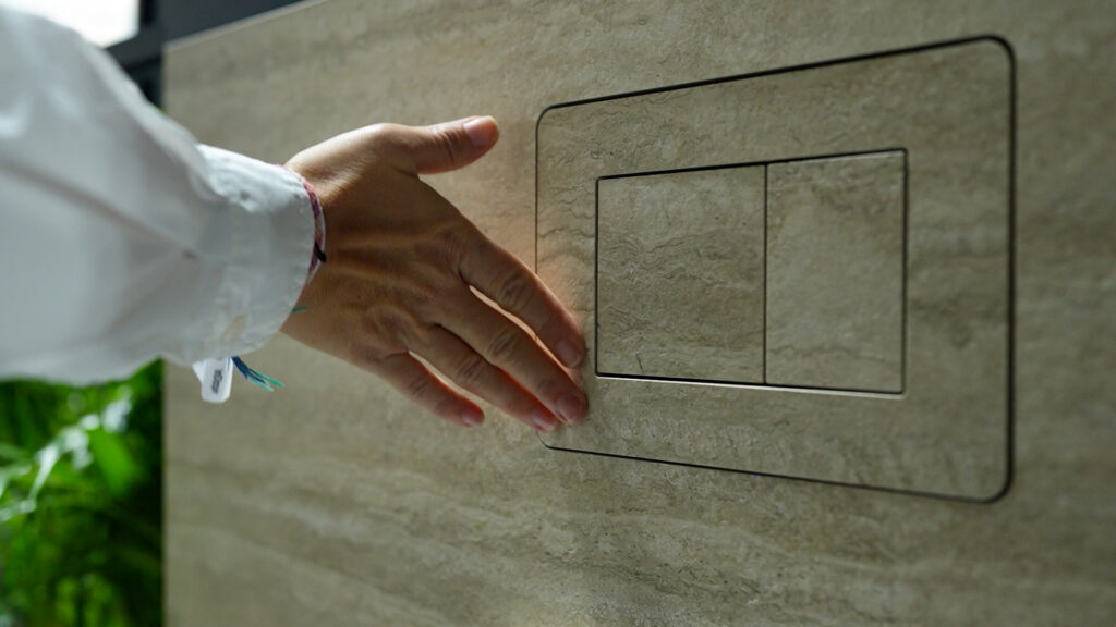 TECE je na sajmu predstavio i Tile 2 tipkalo za ispiranje, inovaciju koja pokazuje koliko detalji mogu promijeniti dojam cijele kupaonice. Pokrov tipkala izrađen je od iste keramike kao i zidna obloga, što omogućuje potpuno stapanje s prostorom.