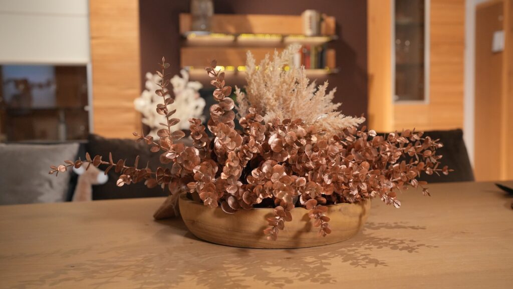 Na stolu dominiraju prirodni tonovi – bež, smeđa, zlatna i bakrena – koji zajedno stvaraju osjećaj topline i elegancije. Umjetni eukaliptus, pošprican bakrenom bojom, dodaje rustikalnu notu, dok bijele magnolije unose svježinu i kontrast. „Magnolije sam dodao kao podsjetnik na kraj ljeta i početak zime – kao simbol prijelaza između godišnjih doba“, objašnjava.