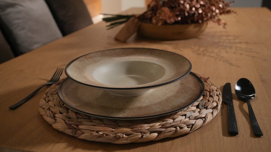 Ovog puta uredio je blagovaonicu u jesenskom tonu, stvarajući prostor koji poziva na zajednička druženja i opuštanje. U središtu uređenja našao se blagdanski stol s jutenim podmetačima, kamenim tanjurima i dekoracijom od bakreno obojenog eukaliptusa. „Tanjuri su otporni i praktični, ali i estetski savršeni. Već ih zamišljam uz juhu od bundeve“, dodaje glumac.