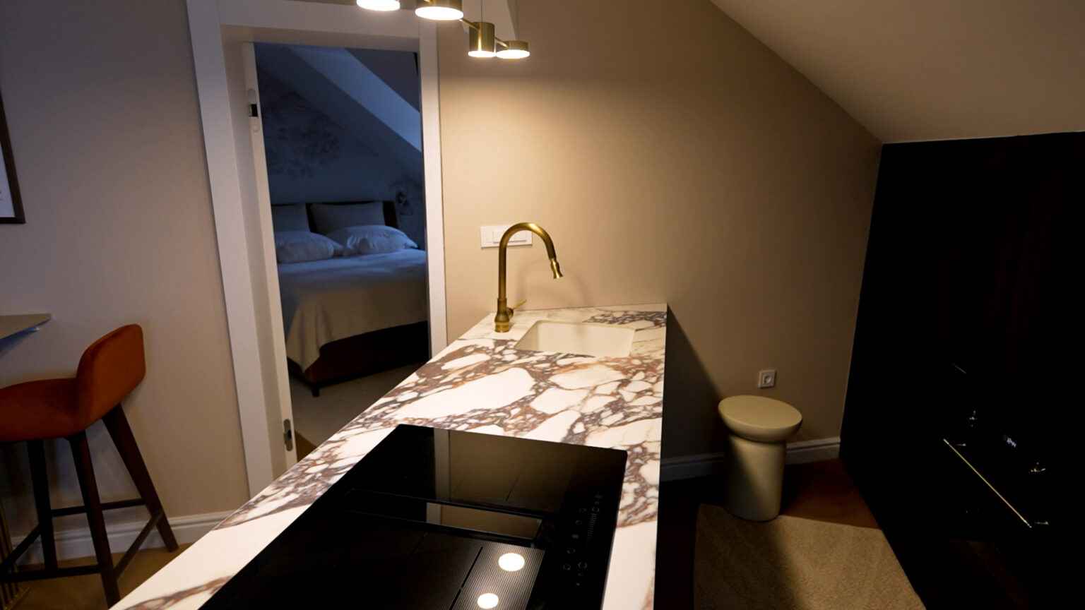 Zlatni detalji unose dašak luksuza i profinjenosti u svaki interijer – posebno kada su pažljivo uklopljeni u moderan dizajn. U ovom interijeru, koji potpisuje dizajnerica Maja Mihovilović, dominiraju tople neutralne nijanse, sofisticirani materijali i akcenti u boji starog zlata, koji prostoru daju elegantan i skladan izgled. Kombinacijom tekstura, boja i funkcionalnog rasporeda stvoren je dom koji odiše stilom i udobnošću.