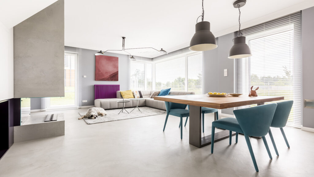 Ovakvo kombiniranje boja i materijala u interijeru ublažava industrijski karakter mikrocementa i čini prostor ugodnijim za svakodnevni boravak.