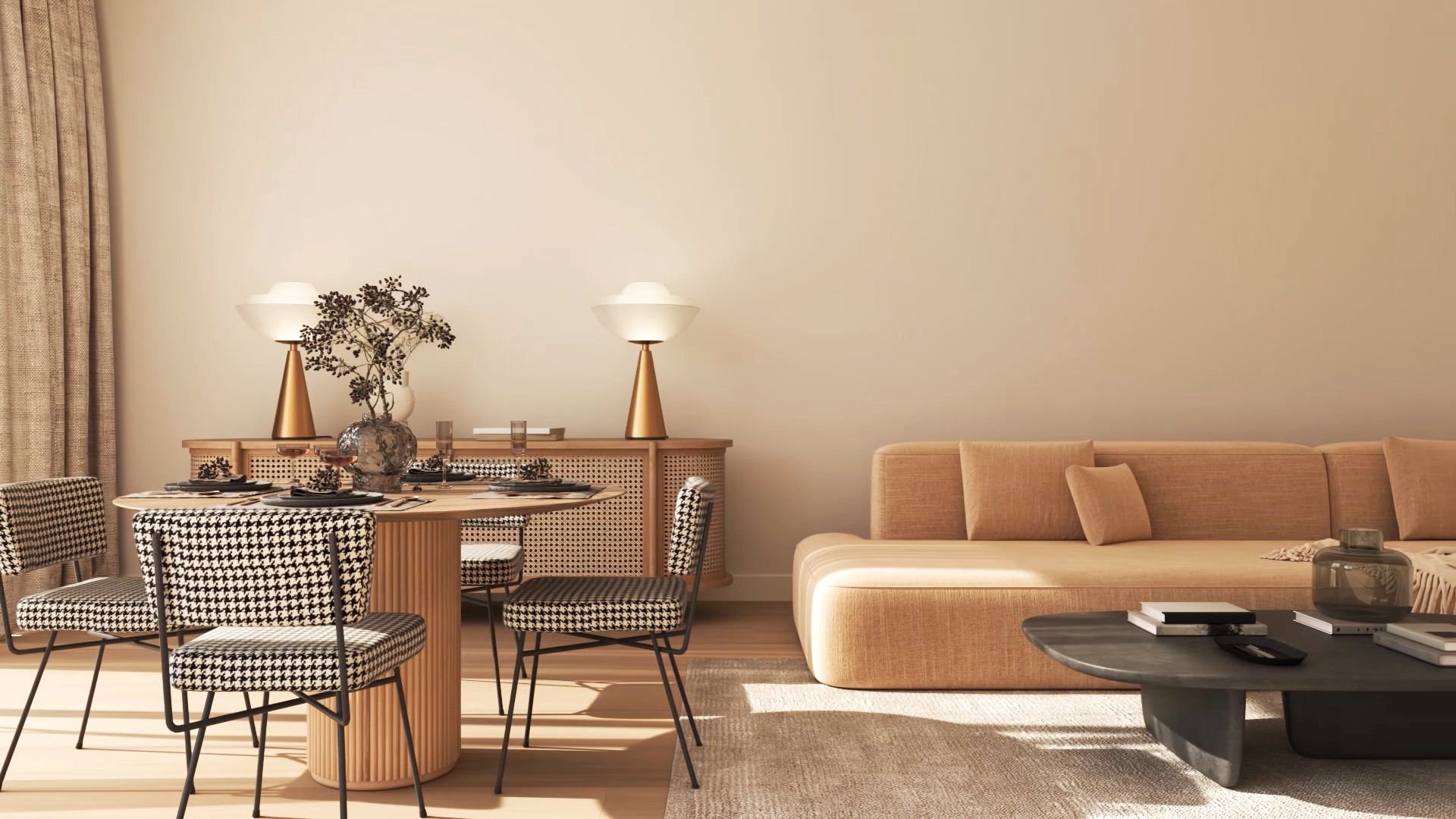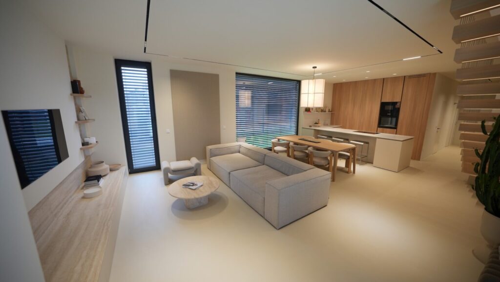 U dnevnim prostorima prevladava bež u kombinaciji s tamnim drvetom, dok su detalji izvedeni u toploj crnoj (tzv. soft black) i antracit tonu (tzv. onyx) — nijansama koje su dovoljno bliske da ne stvaraju oštre kontraste, ali dovoljno različite da prostor ima dubinu.